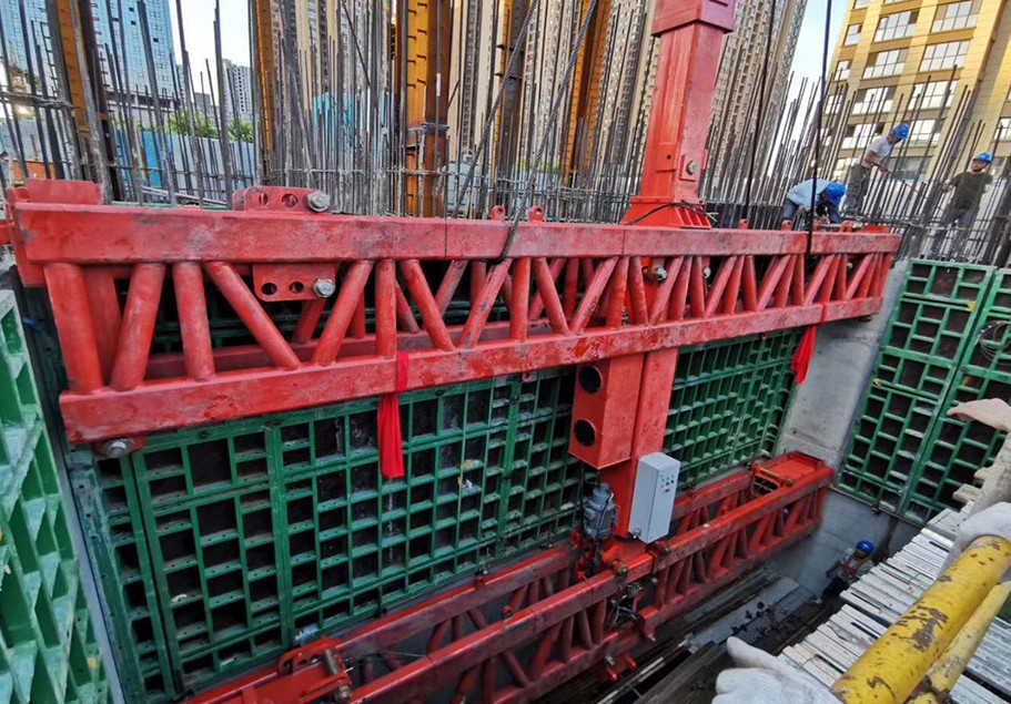 ◆ 整個(gè)平臺(tái)、墻模板、懸吊平臺(tái)均通過液壓機(jī)構(gòu)自爬,減少塔吊工作量,減少人工,提高工作效率。
