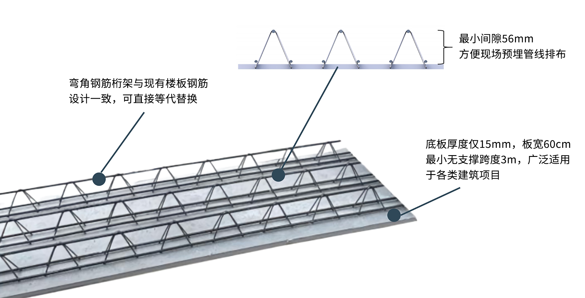 底板上部析架最小間隙55mm,增加了現(xiàn)場預埋管線的允許直徑,方便現(xiàn)場管線預埋并降低了預埋成本 |